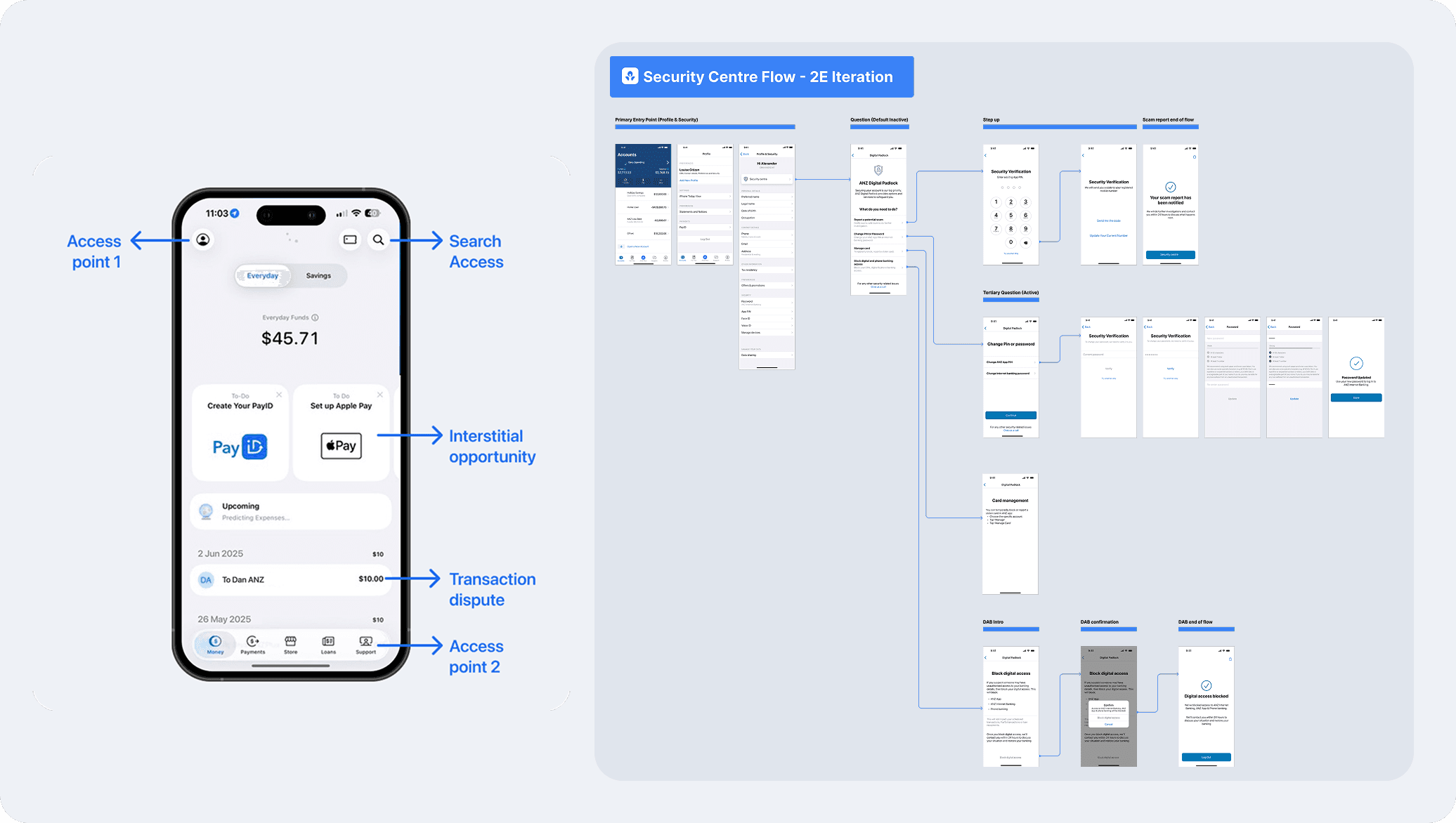 Developed multiple user flow options to explore different entry points and usage scenarios. Phase 1 launched a direct-access model via Security Settings to minimise friction, while a future contextual model will use smart prompts to guide customers during suspicious activity.